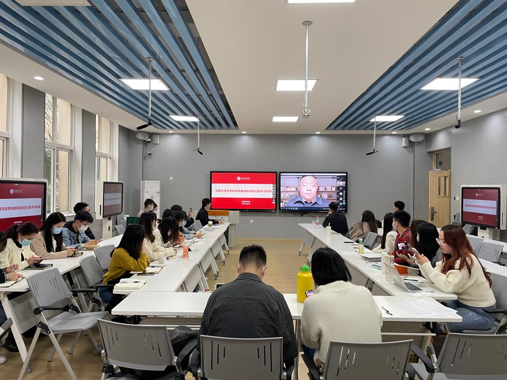 第四部分由传媒与演艺学院名誉院长、北京大学彭吉象教授为我院全体青年教师开展线上讲座《青年教师如何进行教学与科研》。彭院长从青年教师如何进行教学、青年教师如何“为人,为学,为师”、青年教师如何申报科研项目、青年教师如何写作学术论文四个方面进行了详细讲解。彭院长指出青年教师必须具有深厚的学术基础,广阔的学术视野,浓郁的学术兴趣和扎实的学术基础。定位要高,重心要低,保持良好心态,稳步前进。
