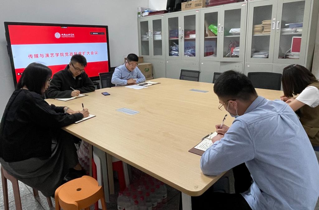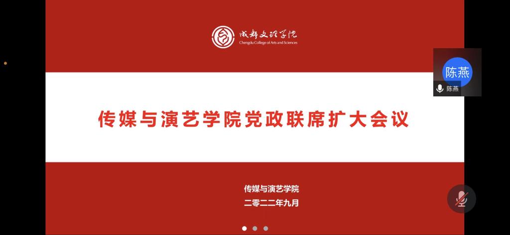 9月26日20:00,传媒与演艺学院在线上线下召开党政联席(扩大)会议,专题研究部署安全稳定工作。学院院长陈燕、副院长马炼、院长助理雷涛、各教研室(副)主任、实验实训中心主任、党支部书记、分团委书记、相关课程负责人及教学秘书参加会议。会议由党总支副书记韩杰主持。