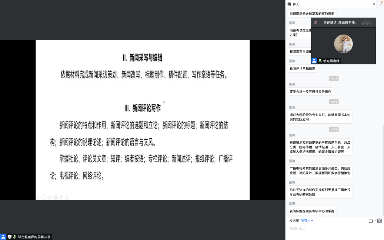下午第二场讲座的邬光照教授从研究生考试的理论知识题型与学习方法、新闻实务题型与高分突破展开,娓娓道来。他强调考研要求的知识是融会贯通可以解决问题的成体系的知识。尤其是客观题考察的理论知识要在脑海中建立框架,掌握知识的理论逻辑关系,争取拿到满分。广播电视专业的同学要多关注新现象和新趋势,多从获奖的新闻作品、广播电视作品案例中反复学习,特别要关注新近获奖的作品以及针对这些作品的专家点评等。除此以外,通过拍摄创作等实践可以进一步掌握采访提纲、采访计划、短视频策划、全媒体传播方案这些实务考题,开拓了同学们的学习思路,要求大家不仅对书本要做到熟练,还需多拓展,多抓实务题,关注热点,打好基础。在讲座过程中,邬老师还根据最近的新闻热点进行了新闻标题、新闻评论角度等实务题型的讲解和提问,通过线上答题互动,同学们对考研实务的要求有了更加深入的理解和具体的掌握。
