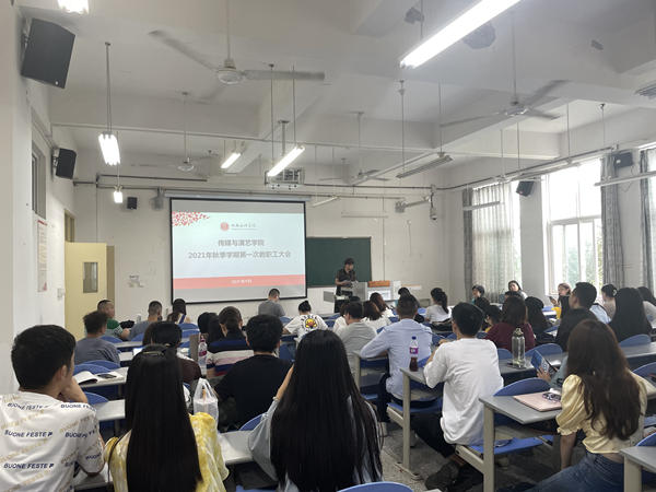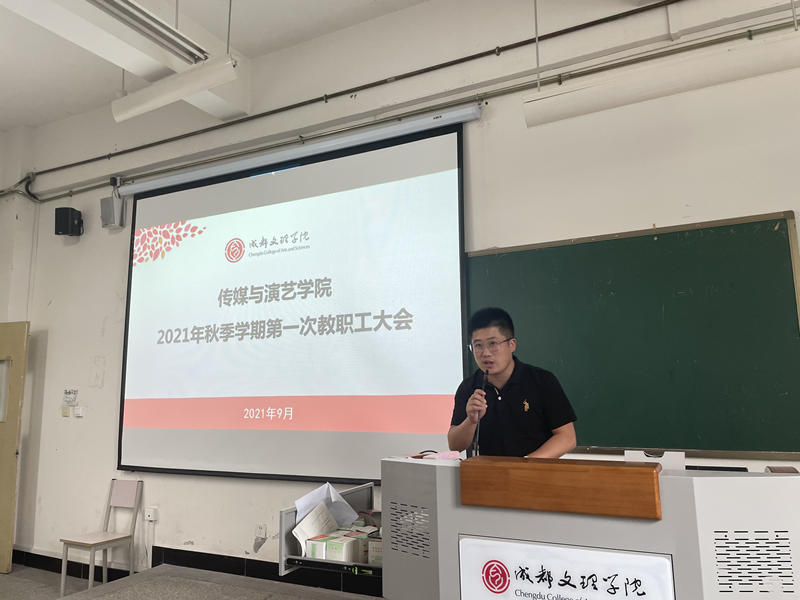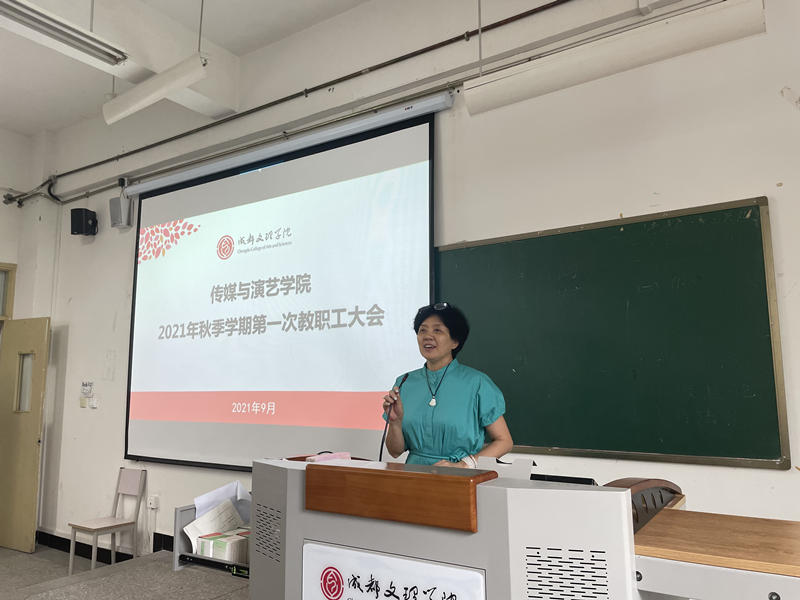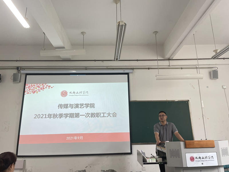 陈燕首先向新进加入传媒与演艺学院的教职工表示了热烈的欢迎,并向新入职教职工介绍了本院的基本情况,之后对假期仍坚守在工作岗位的同志表示了感谢,对假期中学院开展的各项工作做了总结。随后,陈燕就新学期全院的重点工作进行了安排部署:一是再次强调了教学评估的重要性,要求大家以评估标准要求自己,全身心的投入到学校迎评估工作中,认真负责,保质保量的完成新学期教育教学工作;二是结合本学院的教学特点,强调规范性教学的重要性,要求教师严格遵守教学纪律,不断规范自己的教育教学行为,树立师德师风,针对过去工作中发现的问题,提高重视,积极整改。三是对新学期海内外升硕工作提出了新的要求,敦促各教师在日常工作中应切实关注学生的未来,积极为学生提供帮助,为学生的发展指引方向。