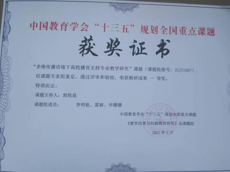 2021年7月13日,由播音与主持艺术教研室主任郭悦昆担任负责人,专职教师李明航、雷崭、申珊珊担任课题组成员的“中国教育学会十三五规划全国重点课题———多维传播语境下高校播音主持专业教学研究”正式结题,并且在中国教育学会荣获教研成果一等奖。