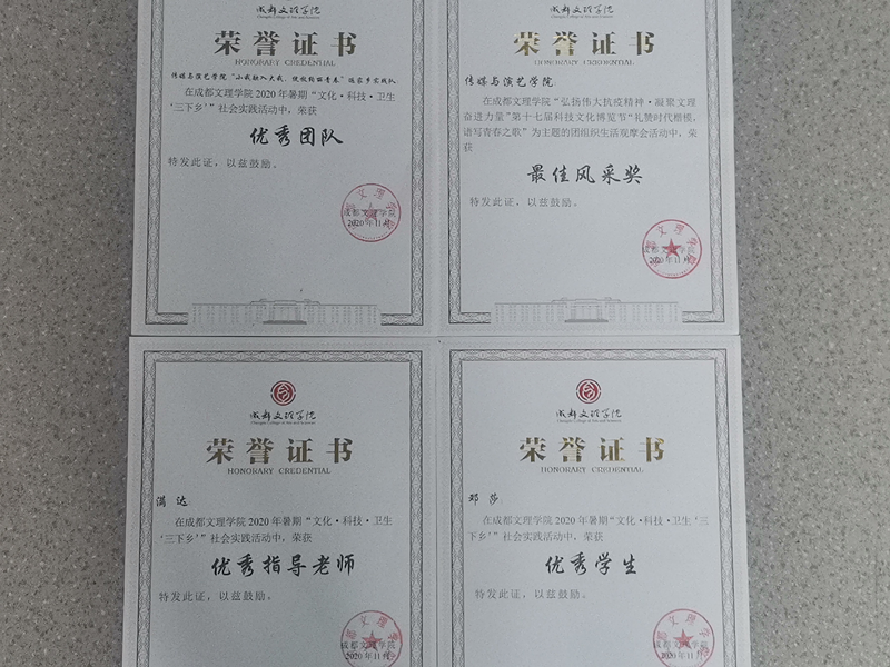 11月19日,成都文理学院在星空剧场举行2020暑期“文化·科技·卫生‘三下乡’社会实践活动”表彰大会。传媒与演艺学院“小我融入大我,绽放绚丽青春”返家乡实践队在此次实践活动中表现突出,荣获“优秀团队”称号,分团委书记满达获“优秀指导老师”称号,学生会主席邓莎获“优秀学生”称号。