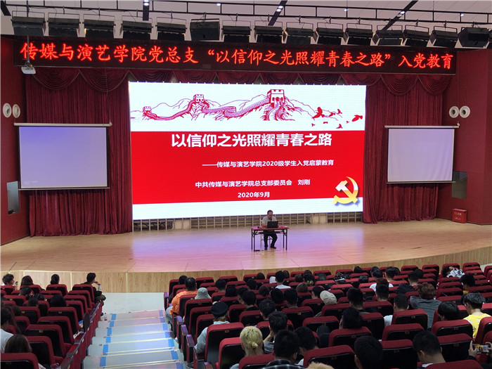 9月30日下午1时50分,传媒与演艺学院2020级新生入党启蒙教育系列之理想信念教育思政大课在文理讲堂顺利举行,传媒与演艺学院党总支书记刘刚、学生工作办公室主任韩杰、学生支部书记和新生辅导员以及2020级新生参与。