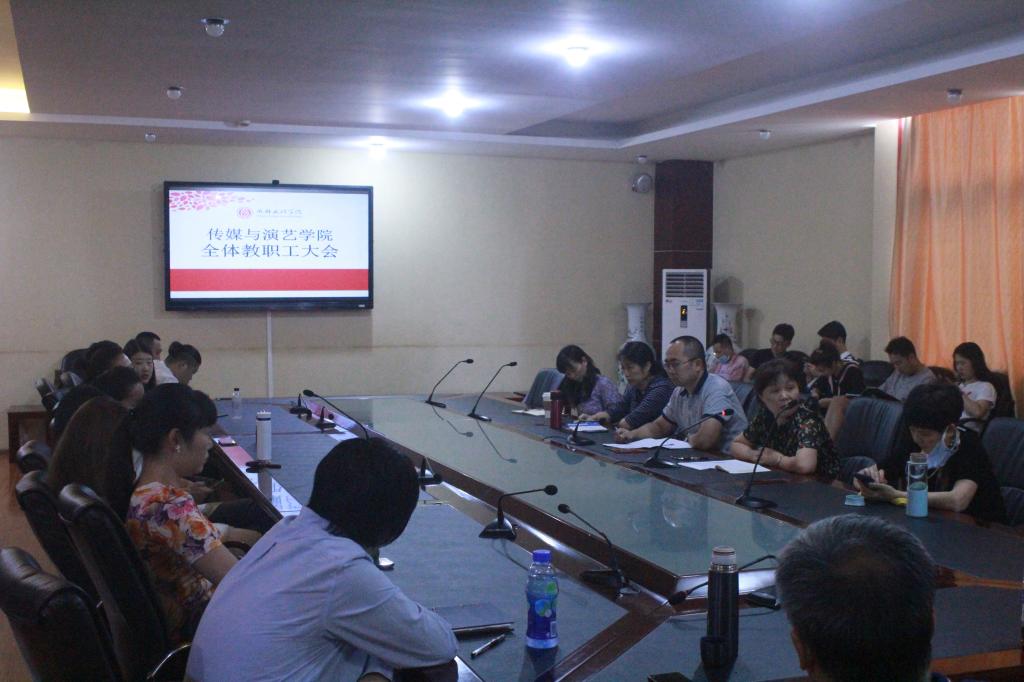 9月3日下午2时,传媒与演艺学院在行政楼第二会议室召开了2020-2021学年第一学期全体教职工大会。传媒与演艺学院院长陈燕、党总支书记刘刚、副院长马炼、表演教研室主任孙珩,播音与主持教研室主任郭悦昆,广播电视教研室主任雷涛,学工办主任韩杰和全体教职工参加会议。会议由刘刚主持。