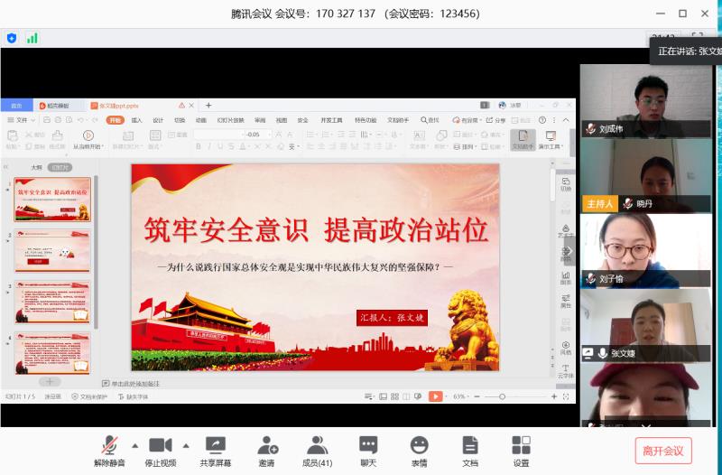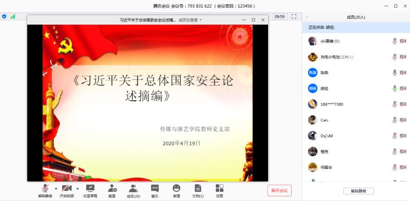 2020.4.15是我国第五个国家安全日,为深入贯彻学习“总体国家安全观”,中共传媒与演艺学院党总支委员会根据学校党委统一领导部署,于2020年4.16日起组织各党支部通过腾讯会议召开以“坚持总体国家安全观,统筹传统安全和非传统安全,为决胜全面建成小康社会提供坚强保障”为主题的云党日活动。