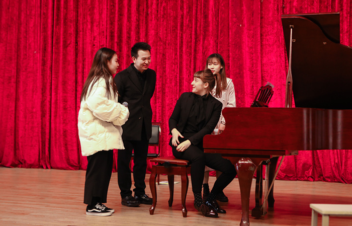 表演结束后,两位大师与现场同学进行亲密互动。音乐表演的两位同学更是上台现场进行钢琴弹奏,Gabriella Balog大师认真感受后给两位同学提出宝贵意见并现场演示,让现场同学收益良多。