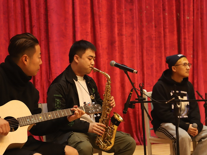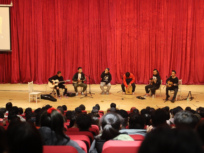 活动伊始,猴子军团演唱了富有国风风韵的流行歌曲《悟空》,同学们随声合唱。歌曲完毕,赢得了同学们热烈的掌声。在互动过程中,猴子军团的成员们分享了许多在创作、排练等方面的有趣故事,现场氛围特别融洽。
