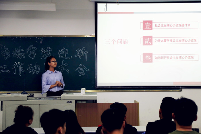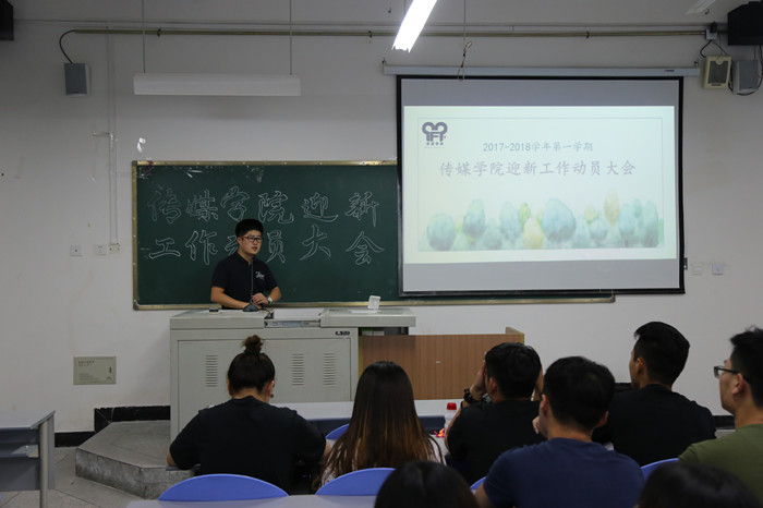2017年9月7日晚,在教学楼B113教室召社会主义核心价值观专题教育大会暨迎新工作动员会,传媒学院学生第二党支部书记、分团委书记韩杰,宣传中心副主任卫晨月、社联指导老师薛耀淇及自管委指导老师陈燕,分团委、社联、自管委全体学生干部参加会议。会议由韩杰主持。