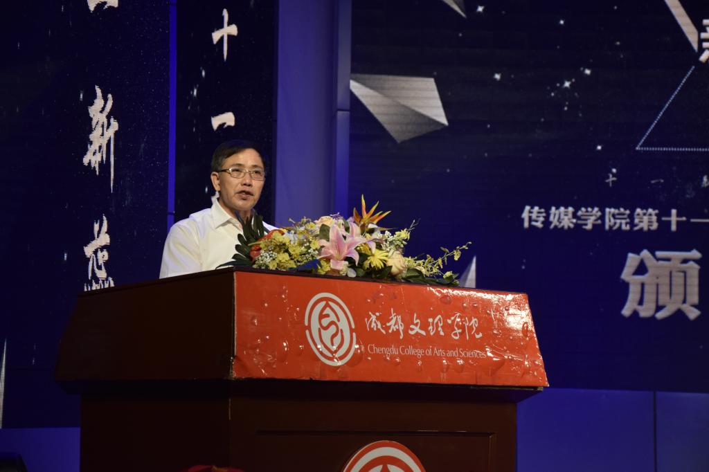 一段动感的舞蹈拉开了本次颁奖典礼的序幕,点燃了现场气氛。传媒学院院长刘吾康上台致辞。他讲到,影像光耀着梦想,奖杯彰显着实力,新蕊杯培养出的是专业实践能力强的人,是为了激励有理想的青年人去追求去拼搏。刘吾康对本次大赛组委会和各位老师的指导与付出表示感谢,还特别感谢海平教育集团对本次大赛的大力支持。