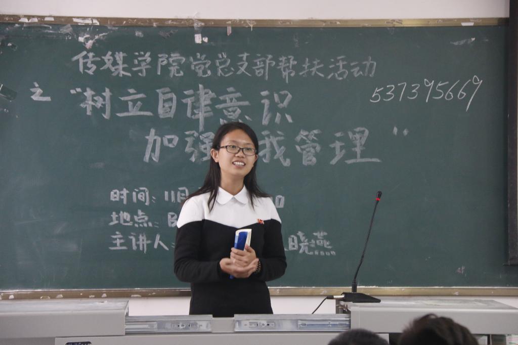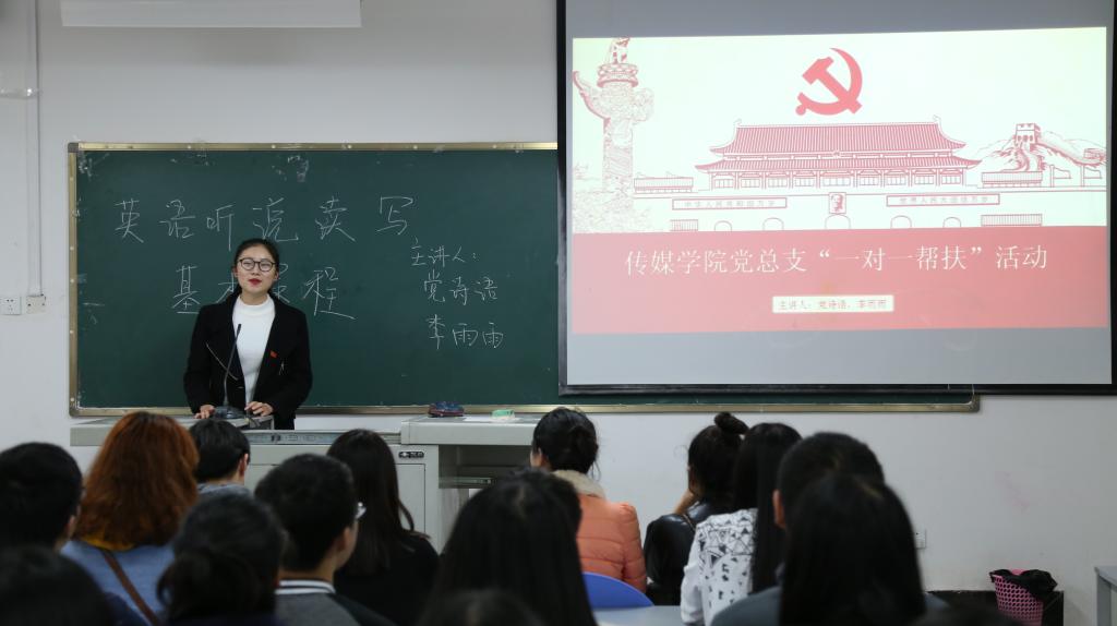 课上集中讲授时,传媒学院党总支书记、学工办主任李江,传媒学院第一学生党支部书记章婷,传媒学院第二学生党支部书记胡佳,传媒学院分团委书记韩杰,传媒学院全体辅导员来到课堂了解受助同学情况,并表达关怀。