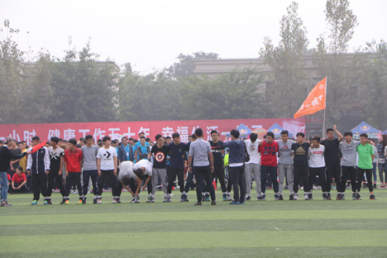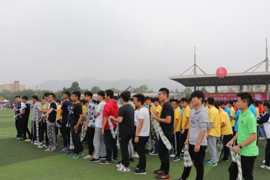 上场了的男生们士气满满,互相捆绑着腿上的绳子,大声的为彼此加油。