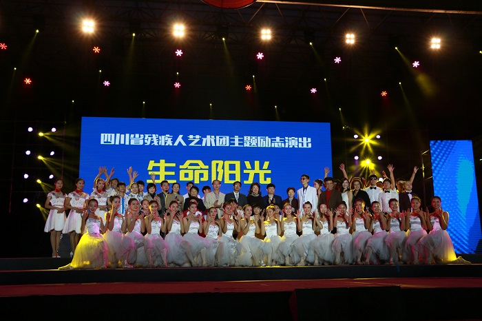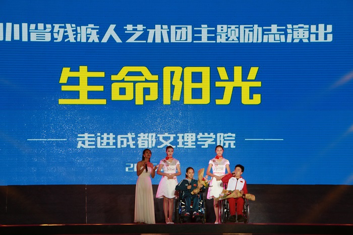 在黑暗中追逐光明,在无声里感悟旋律,在轮椅上展翅飞翔,演绎生命的礼赞。四川省残疾人艺术团《生命阳光》公益励志主题演出于10月17日晚7:00点在成都文理学院金堂校区操场隆重上演。 出席本次演出的领导和嘉宾有四川省残联副理事长杨志远、成都文理学院院长曾晓荣、成都文理学院党委书记高华锦。四川省残联副理事长、里约残奥会中国体育代表团射击队领队杨志远为本次演出致辞,向大家讲述了艺术团和残奥会运动员们顽强拼搏、自强不息的故事,并且通过小游戏现场互动,使同学们切身体验盲人日常生活的艰辛和不易。