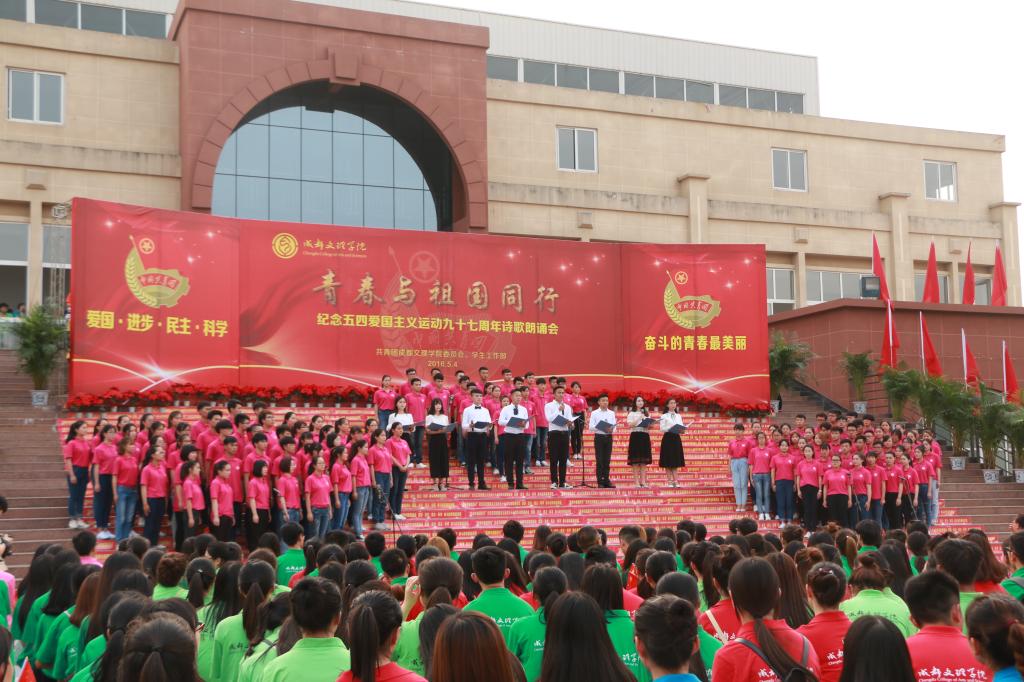 2016年5月4日是五四运动97周年纪念日,为纪念五四运动,弘扬五四精神,成都文理学院在星空广场举办主题为“青春与祖国同行”的大型诗歌朗诵会。此次朗诵会共有十六个学院、近千名学生参加,他们经过十几天的辛苦训练和排练,终于在今天登上了诗朗诵的舞台。