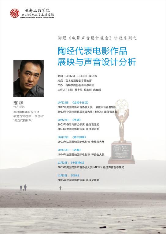 陶经教授是中国著名电影声音指导,被誉为“中国第一录音师”和“第五代的耳朵”,中国传媒大学艺术学部教授会副主席,在国际国内屡获电影声音大奖。11月4日由学校科研处与传媒学院联合举办了“陶经电影声音创作观念”专题讲座。为配合这个讲座的开展,传媒学院影视创作基础教研室在艺术楼数字放映厅举办了“陶经代表电影作品展映和声音设计分析”系列活动,为期一周,从10月26日到11月3日,每晚19点到22点,主讲老师为刘丽、苏宇思、武智超和戴安烈。