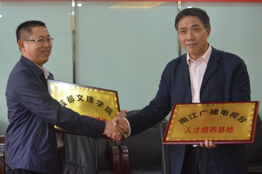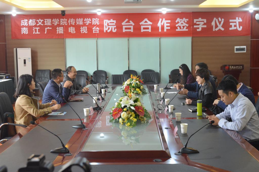 在这秋高气爽的季节里,为培养适应社会发展需求的应用型人才,我院迎来又一次的校台合作。10月29日下午3点整,我院与南江广播电视台校台合作签约仪式在行政楼第二会议室隆重举行。出席仪式的双方领导包括:文理学院副院长谢瑶函、就业办公室副主任袁吉发、我院院长刘吾康、副院长李晓川;南江广播电视台副台长王廷彬、南江广播电视台总编室主任谭真理等。