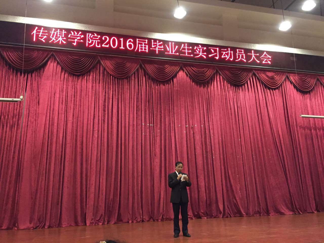 随着传媒学院全体2012级的同学在校理论学习阶段基本结束,按专业人才培养方案和教学计划的安排,我院2016届毕业生将奔赴相关单位进行实习。为了部署好专业实习工作,10月28日晚6:30在成都文理学院文理讲堂举行了传媒学院2016届毕业生实习动员大会。会议的主要内容是宣布我院毕业实习工作方案,安排布置毕业实习相关事宜,开展实习期安全教育。传媒学院院长刘吾康,副院长李晓川,学院党总支书记、学工办主任李江,教务办公室葛青老师以及12级毕业生们参加了此次会议。大会由陈金辉主持。