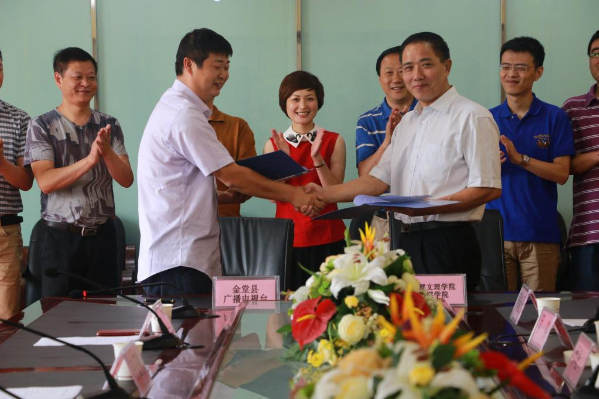 讲话结束后仪式顺利进行到关键的一项,传媒学院院长刘吾康与金堂县电视台台长余忠正式签约并进行了授牌仪式,在场人员纷纷表示祝贺。
