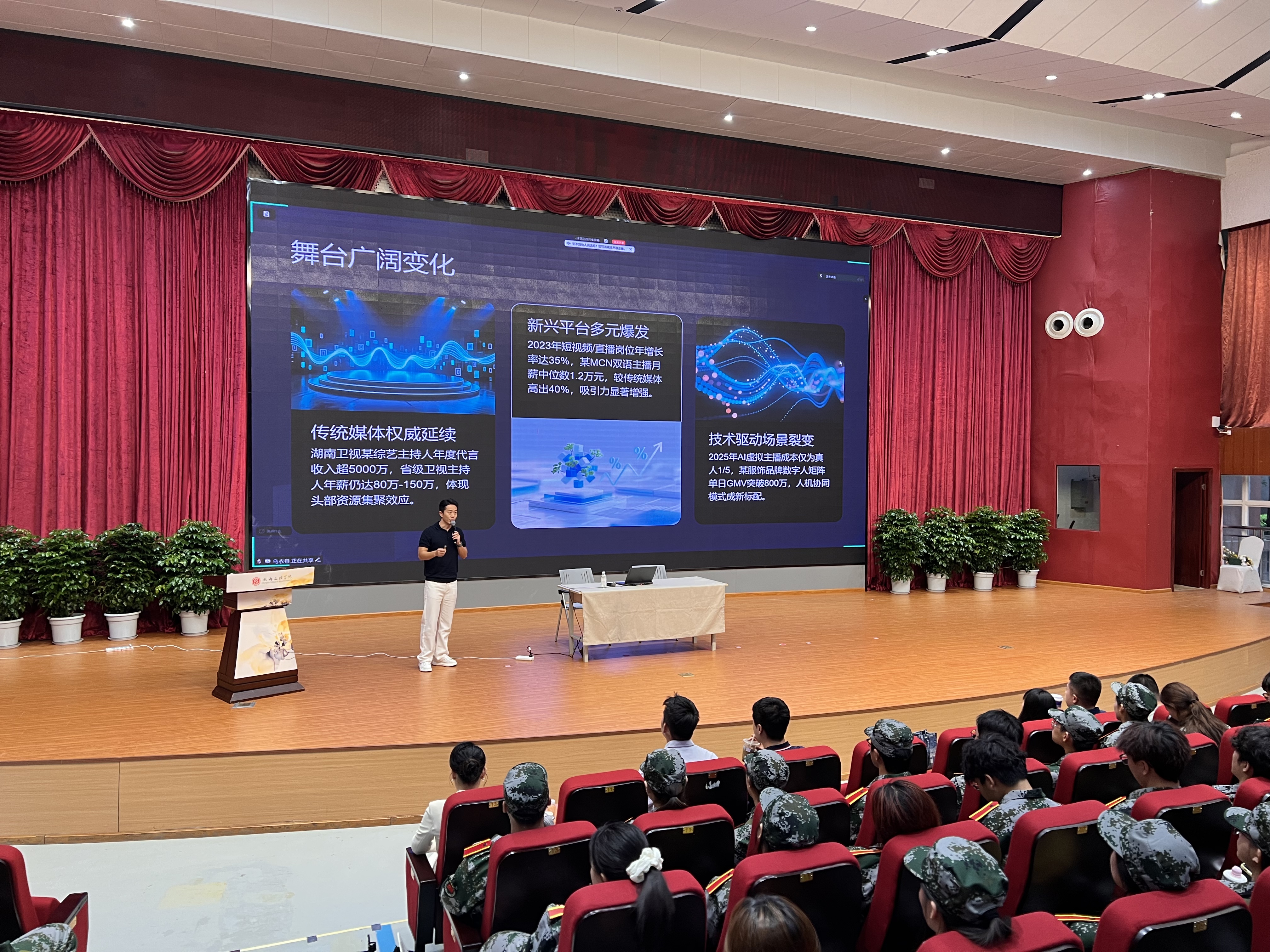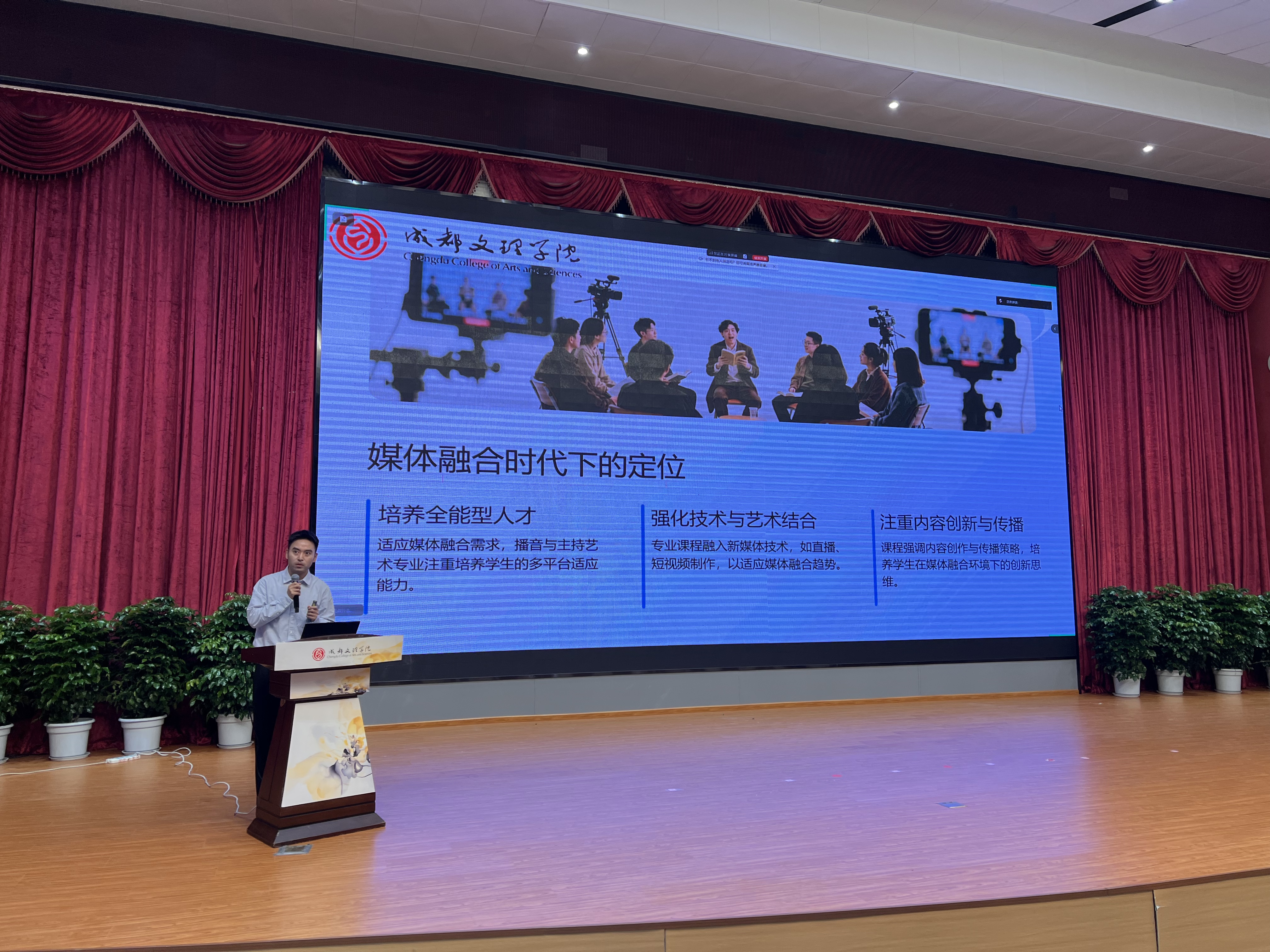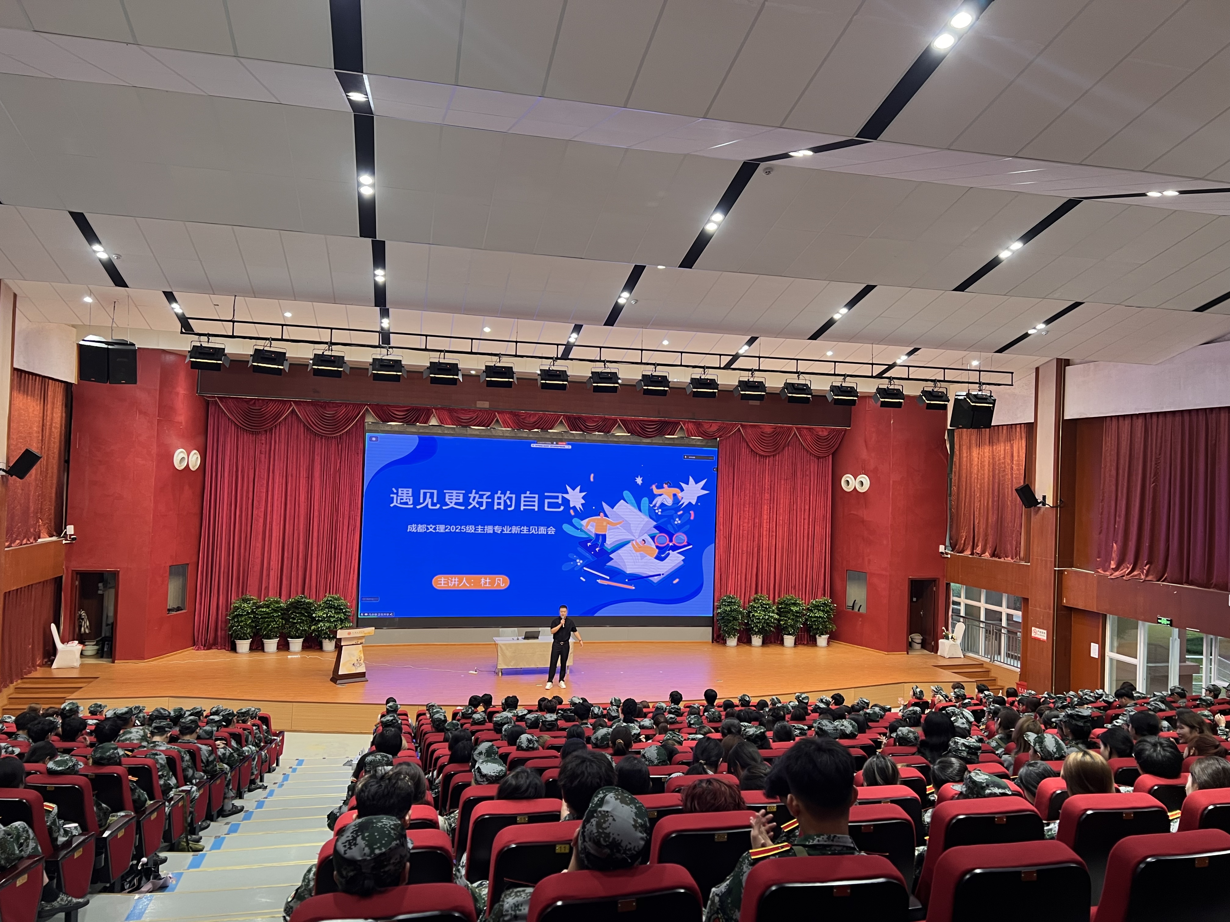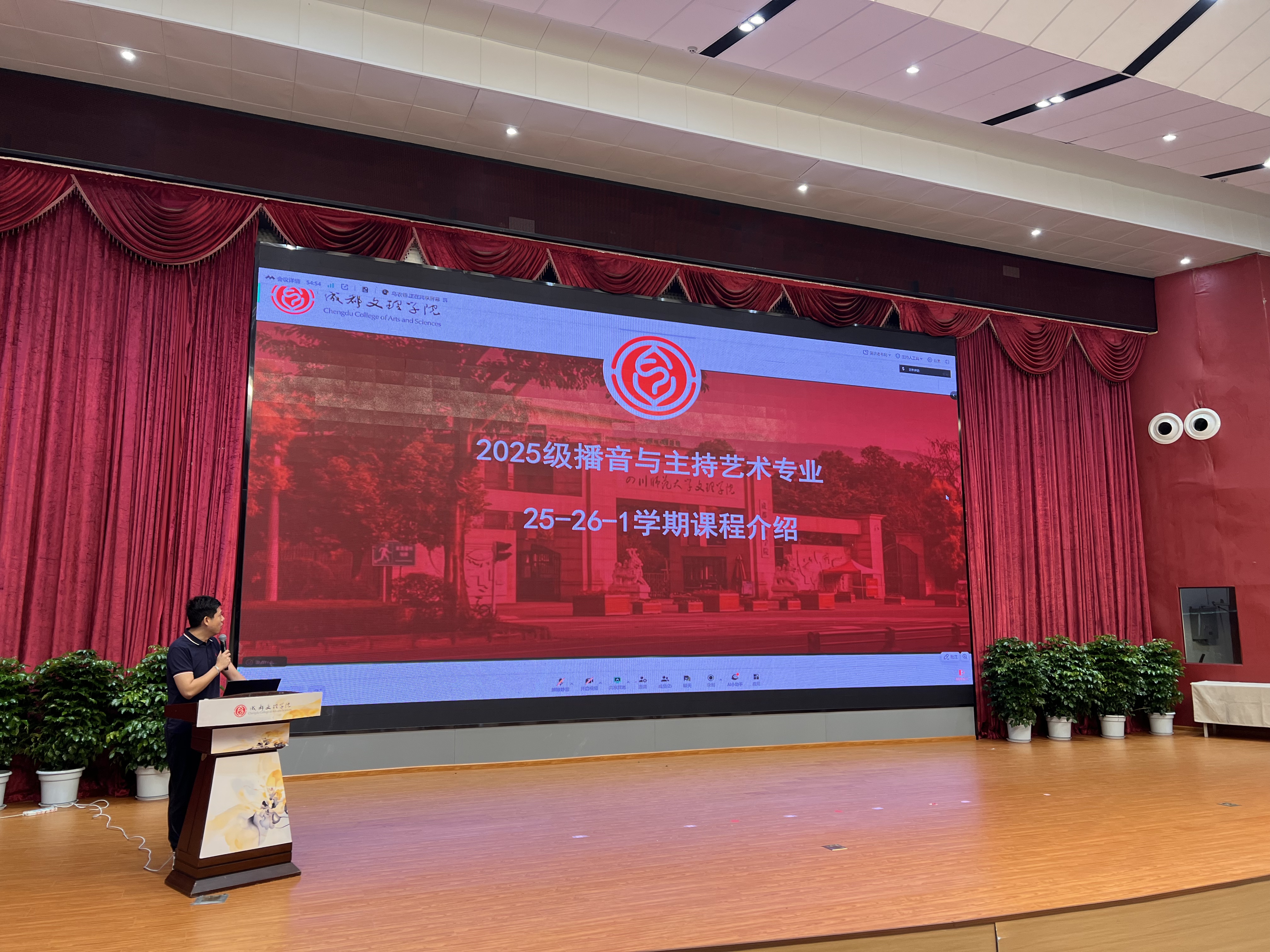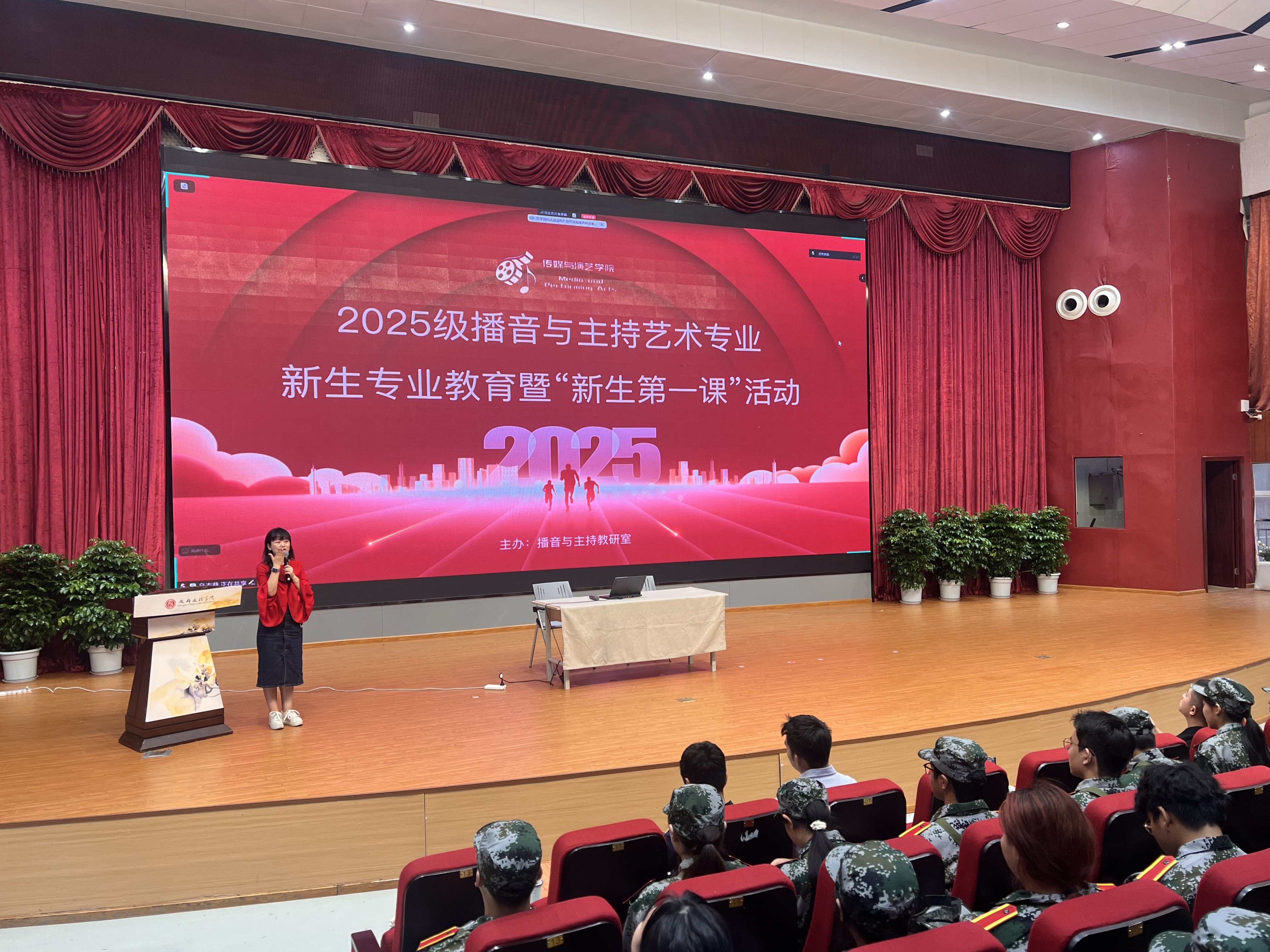 金秋送爽,丹桂飘香。2025年9月18日上午8点30分,播音与主持教研室于文理讲堂隆重举行了2025级播音与主持艺术专业新生专业教育暨“新生第一课”活动。本次活动旨在帮助新生全面了解专业内涵,明确学习方向,顺利开启大学新征程。院长助理雷涛、教研室副主任李明航及播音专业大一年级专业教师、辅导员以及全体2025级播音专业新生参加专业教育。特邀成都电视台刘彬意、省级专业赛事评委杜凡开展职业生涯规划。活动由播音专业教师陈鹏宇主持。
