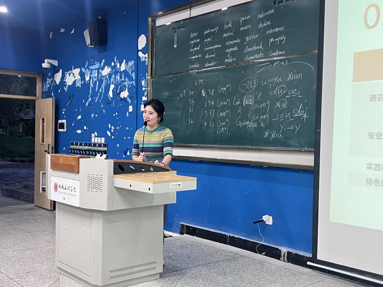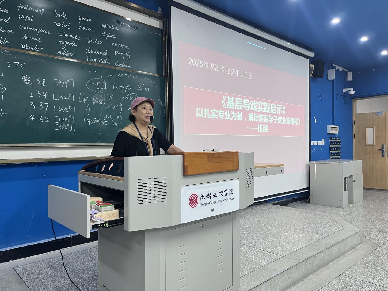 课堂伊始,表演教研室主任邹倩从培养目标、课程设置、实践环节等方面,系统介绍了表演专业的发展历程。她指出,自2008年创办至今,表演专业已从32名学生的单一班级,发展为在校生超千人的成熟专业,积累了丰富的教学经验。邹倩寄语新生:“请忘记过往的光环或标签,从今天起,你们的录取通知书是一张白纸,也是一份沉甸甸的承诺。表演艺术的核心不是‘演’,而是‘真’。未来四年,我们将共同学习如何拆除心墙,真诚地感受生活、理解人性,在舞台上塑造有血有肉的生命。”随后,2025级专业课教师依次登台,与新生见面。老师们一致强调,大学时光弥足珍贵,同学们既要打磨专业技艺,也要锤炼艺德、涵养人文素养,努力成长为有理想、有担当、有温度的新时代文艺工作者。院长助理曹飞越老师以历史人物王长益的故事为例,深刻剖析了艺术学子在面对压力与期待时应有的态度。他鼓励同学们摒弃“坐以待毙”的惰性,主动向老师这座“灯塔”前行,以拼搏之姿驶向成功的彼岸。在热烈的掌声中,伍越老师开展题为《基层导戏实践启示:以扎实专业为基,解锁表演学子就业新路径》的讲座。她结合数十年基层戏剧创作经验,指出演员是传递美好故事的重要载体,并强调基层市场对优秀演员的需求持续增长。伍老师鼓励同学们夯实专业基础,未来积极投身基层舞台,成为一名传递美好的优秀演员。传媒与演艺学院院长许春林教授则从竞赛参与角度,为同学们剖析现状、提出建议。他指出,表演专业学生虽在声台形表等综合能力上表现突出,但参赛类型多局限于戏剧类团体项目,对演讲、朗诵等个人赛事参与不足,错失了宝贵的锻炼机会。许院长强调,表演是高度实践性的学科,同学们应积极投身各类竞赛,全面提升专业本领。