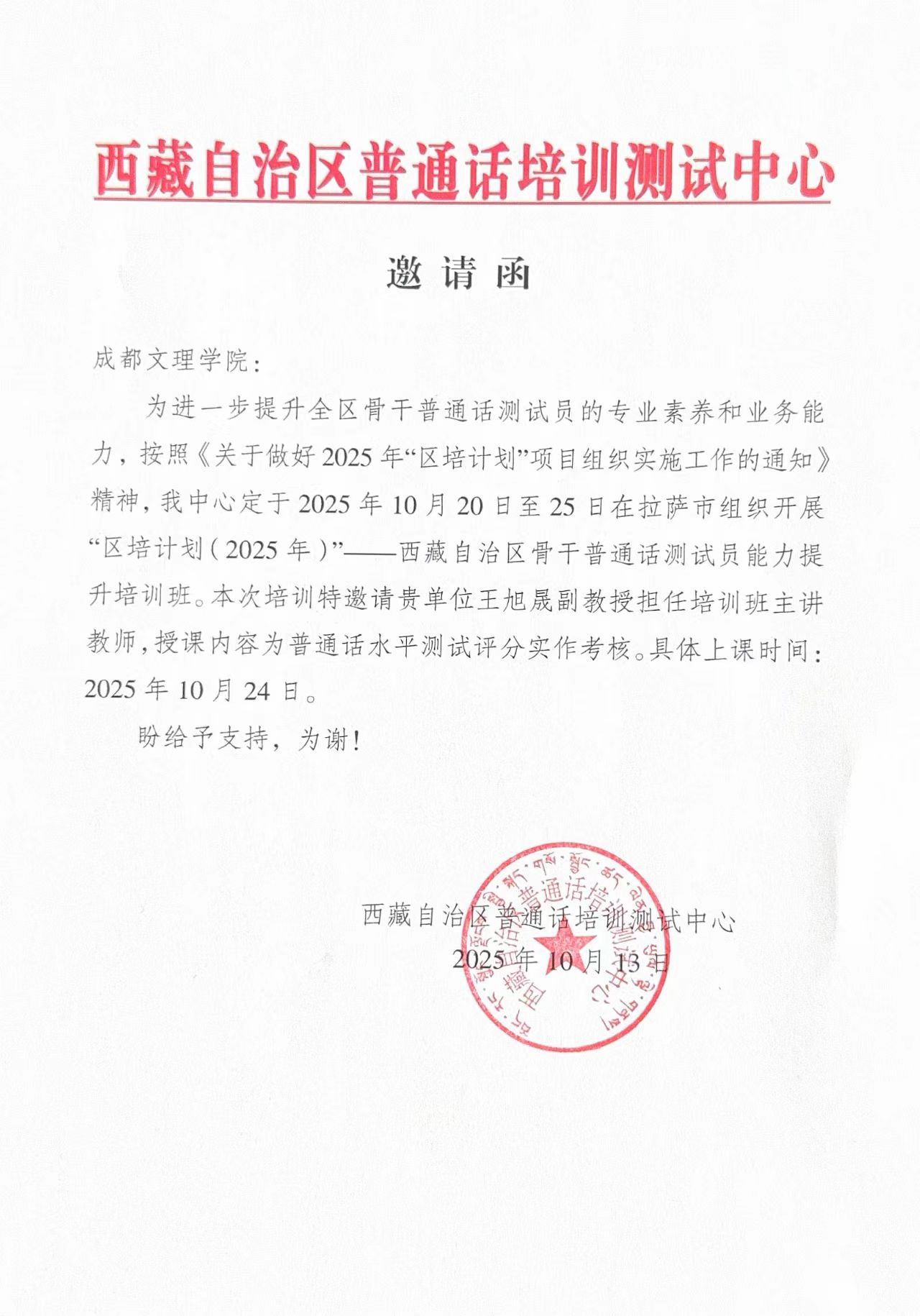 2025年10月24日,传媒与演艺学院播音主持教研室副教授、国家级普通话测试员王旭晟,受西藏自治区教育厅(普通话培训测试中心)邀请,远赴拉萨市参与“区培计划(2025年)——西藏自治区骨干普通话测试员能力提升培训班”的授课工作,以专业力量助力高原地区国家通用语言文字推广普及事业。