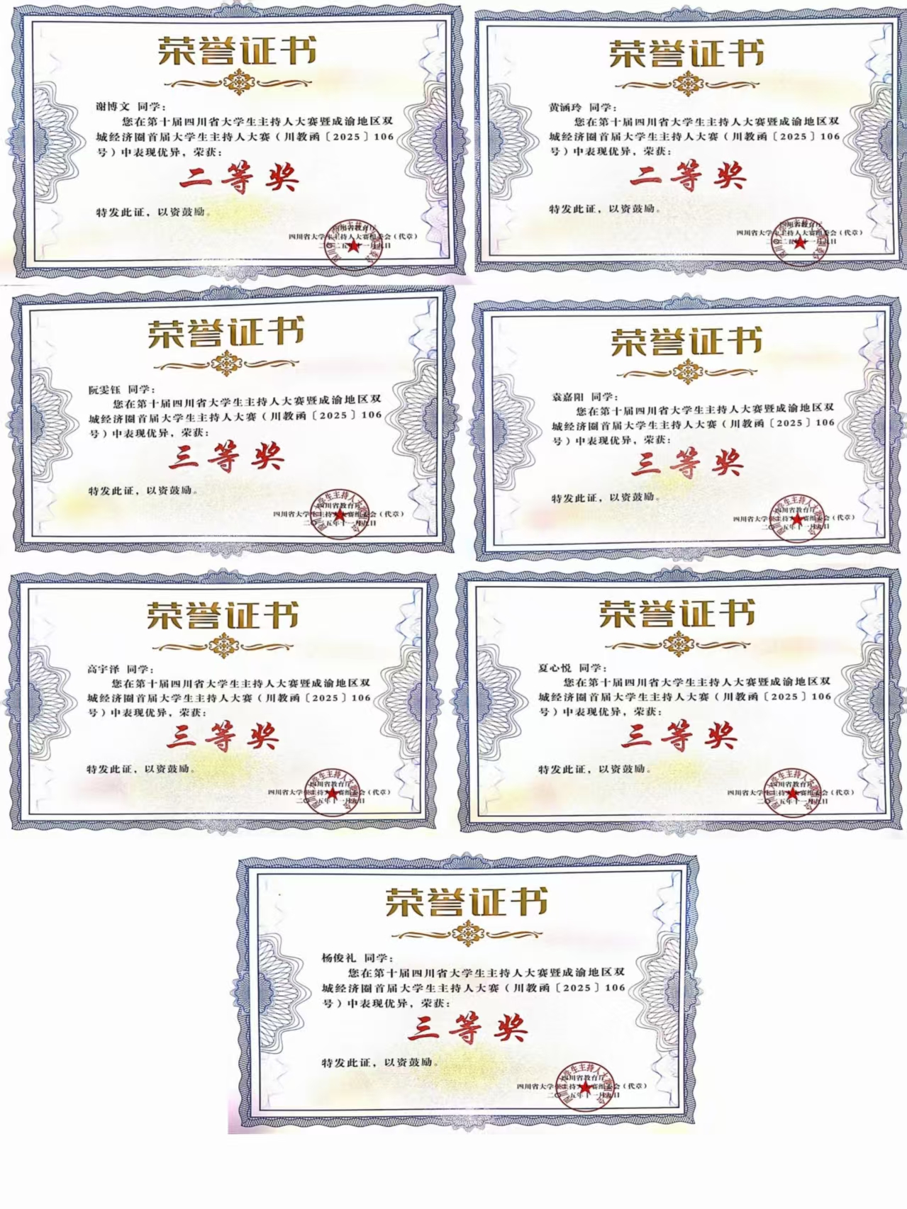 11月9日,由四川省教育厅主办的第十届四川省大学生主持人大赛暨成渝地区双城经济圈首届大学生主持人大赛圆满落幕。传媒与演艺学院9名播音与主持艺术专业学生,经校内选拔出战省赛,凭扎实功底、沉稳发挥与个人魅力脱颖而出,最终斩获二等奖2项、三等奖4项的殊荣。