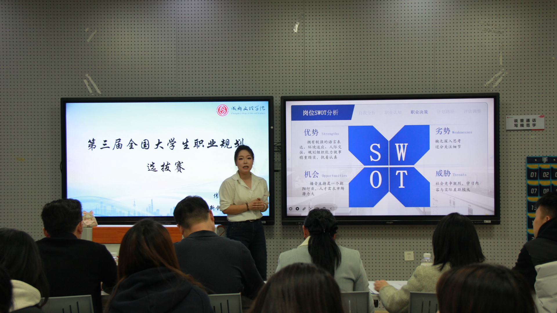 为帮助学生明确职业发展方向,增强就业竞争力,2025年11月21日下午14:00,传媒与演艺学院于C203教室顺利举办以“逐梦未来・职引芳华”为主题的第三届大学生职业规划大赛院内选拔赛。成都文理学院团委书记、学工部副部长郑巍巍,传媒与演艺学院党委书记韩杰,学工办主任李界辰及师生代表出席并参加比赛,学校就业创业服务中心教师许夏,学院辅导员王艳菊、张须鹏、尹凤担任比赛评委。