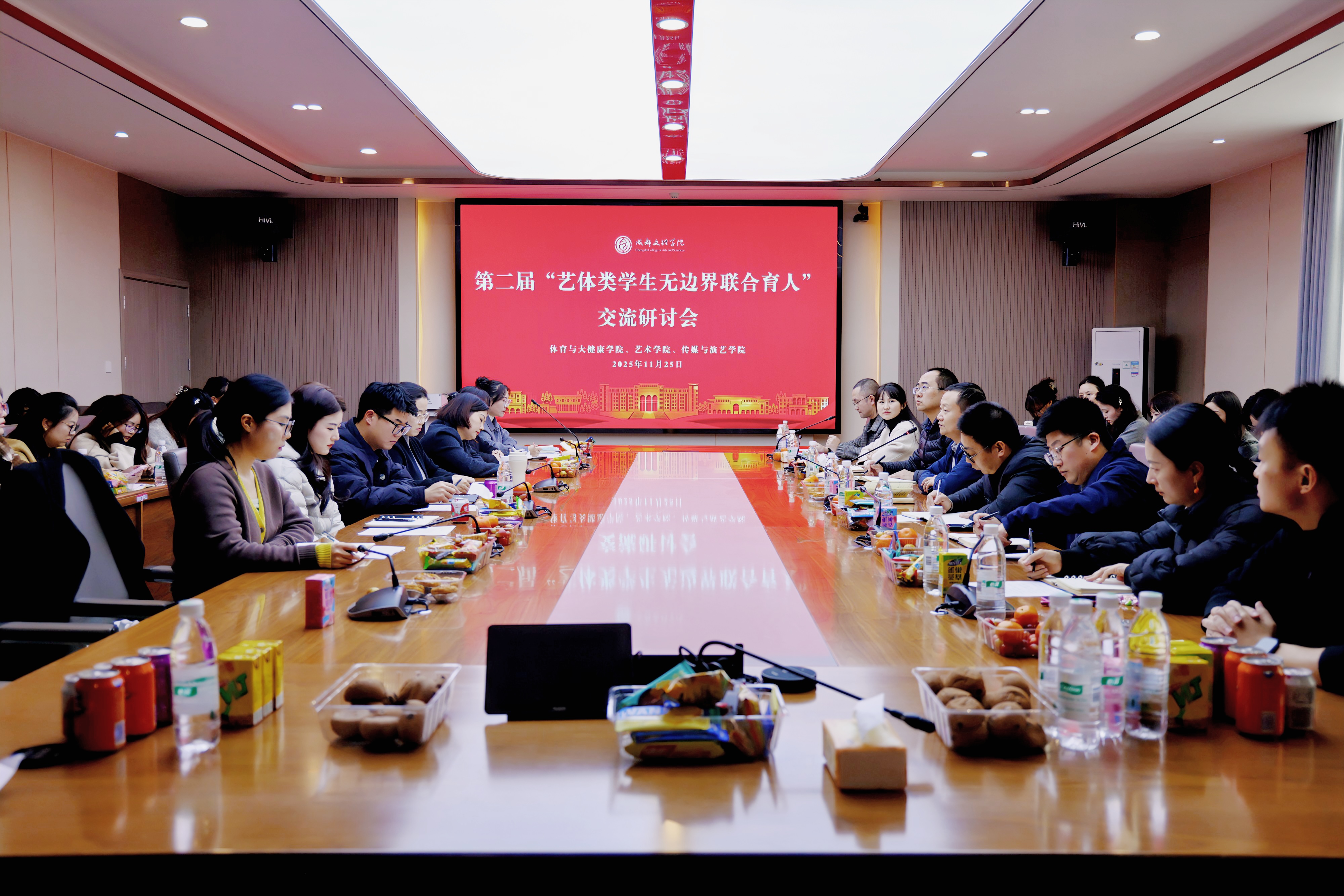 11 月25日下午14点,艺术学院、体育与大健康学院以及传媒与演艺学院于第二会议室联合举办了第二届“艺体类学生无边界联合育人”交流研讨会。本次研讨会聚焦为进一步深化艺体类学生的培养模式改革,提升国际化育人质量。成都文理学院党委副书记、纪委书记王亚军,艺术学院党委书记、副院长黄鑫,体育与大健康学院党委书记刘刚,传媒与演艺学院党委书记韩杰,学生工作部部长助理卢佳,各学院学生工作办公室主任和相关辅导员参会。会议由艺术学院学工办主任文苛如主持。