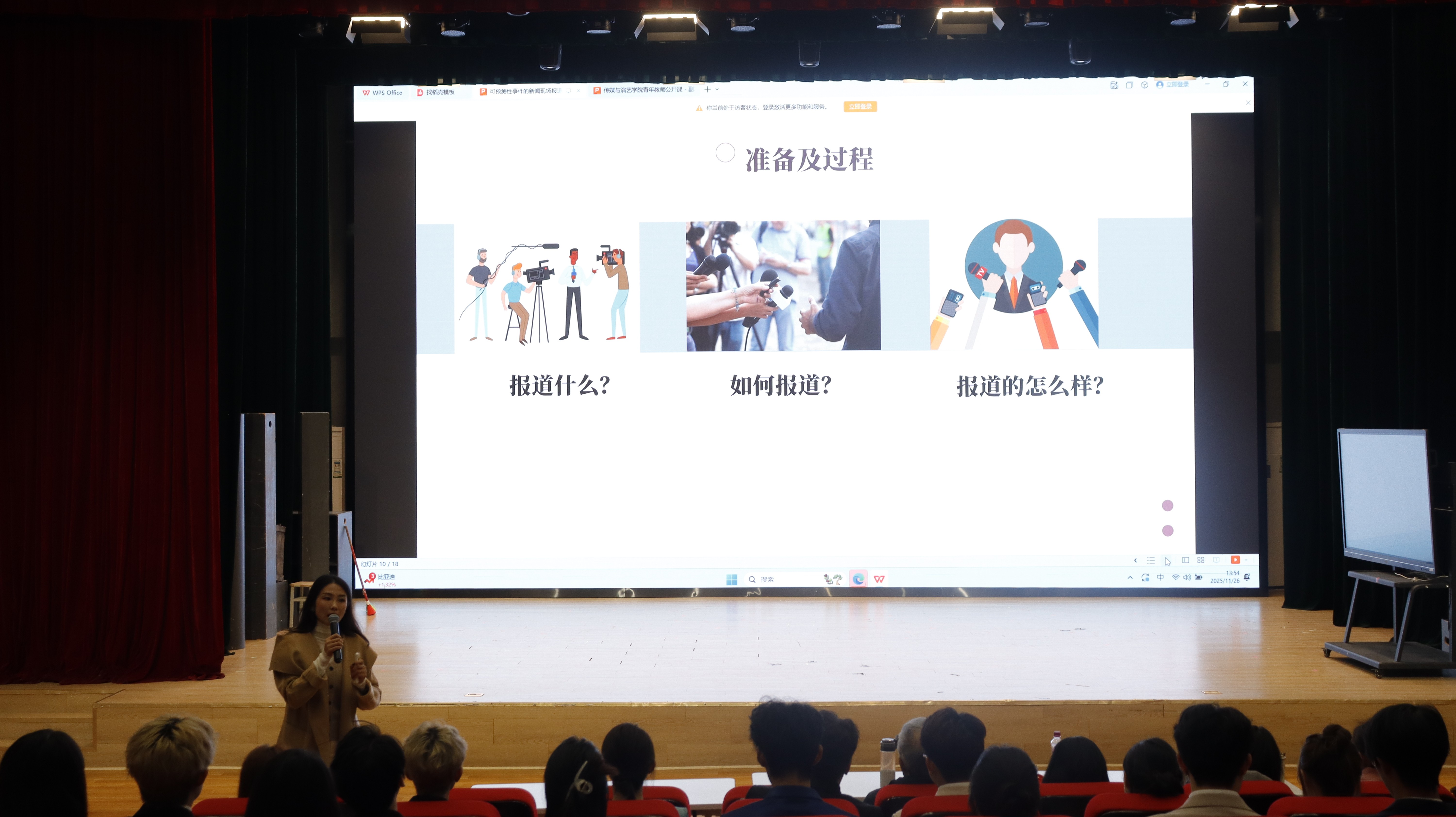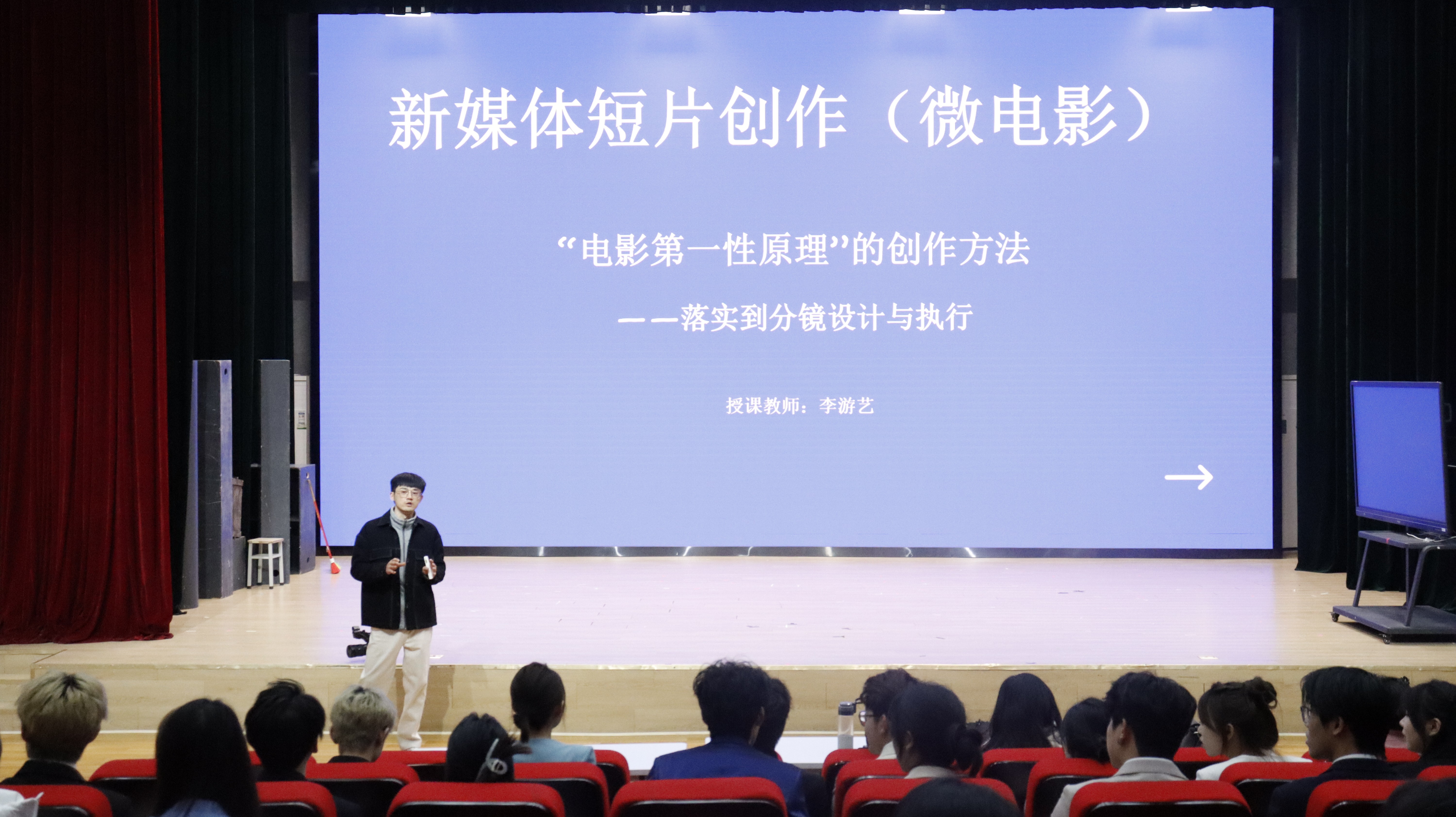 雒婧彤围绕“可预测性事件现场报道”主题,明确其“第一时间、第一现场传递信息”的核心定义,拆解“资料搜集-信息筛选-细节抓取”的完整流程,强调“真实性、及时性、公开性”三大特质。随后《新媒体短片创作(微电影)》李游艺以“电影第一性原理”为核心,引导学生回归“光影声音讲述故事、引发情感共鸣”的创作本质。实操环节中,师生以“异地恋情侣争吵”剧本为案例,分层训练分镜设计:落实“轴线规则”避免空间混乱,通过“正反打镜头”强化情绪共情,尝试“一镜到底”、“甩镜头”等风格化手法,结合互评优化镜头冗余,提升学生镜头语言运用能力。 张海涛进行《台上的高呼与低语》舞台表演课程。张海涛聚焦“舞台表达的情绪张力”,解析高呼适用于情绪爆发等场景,需气息支撑;低语多用于倾心交谈等情境,需含蓄清晰的应用逻辑,以剧情片段实操引导学生用高低语交替呈现情感,纠正常见表演问题,夯实舞台表达的核心能力。