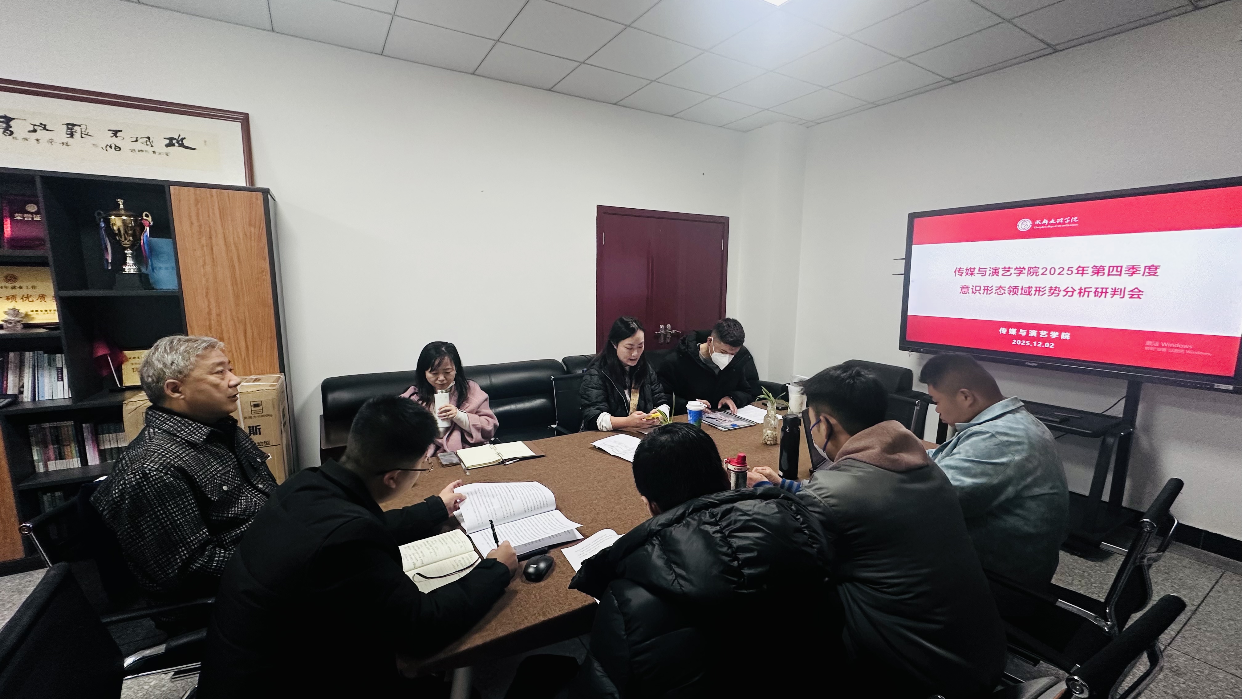 2025年12月2日中午,传媒与演艺学院组织召开2025年第四季度意识形态领域形势分析研判会。学院院长许春林、党委书记韩杰出席会议,院长助理、各教研室负责人、学工办负责人参加会议,共同围绕学生安全稳定、教学管理规范、师德师风建设、期末实践考试等重点领域潜在风险展开分析研判。