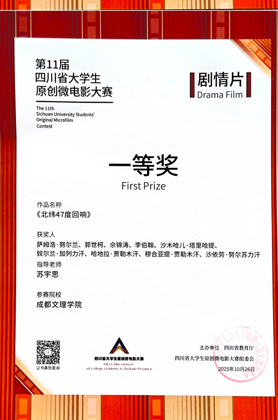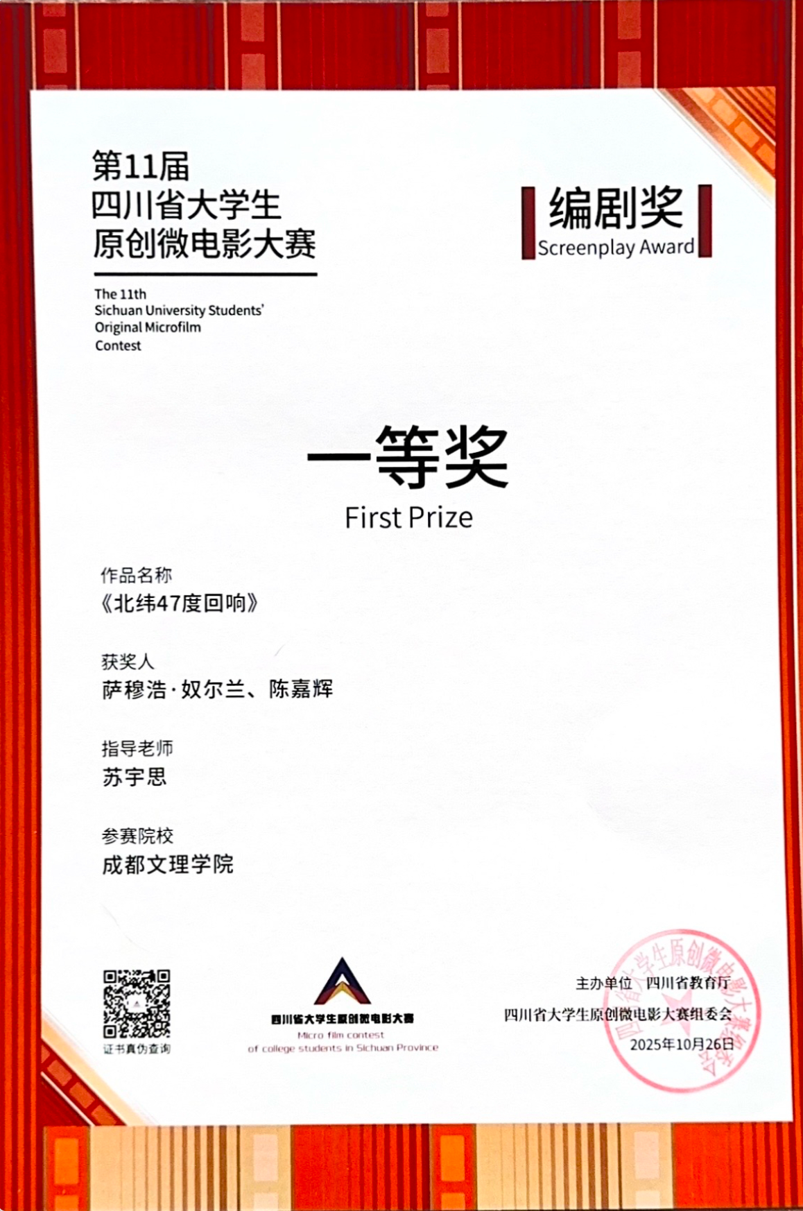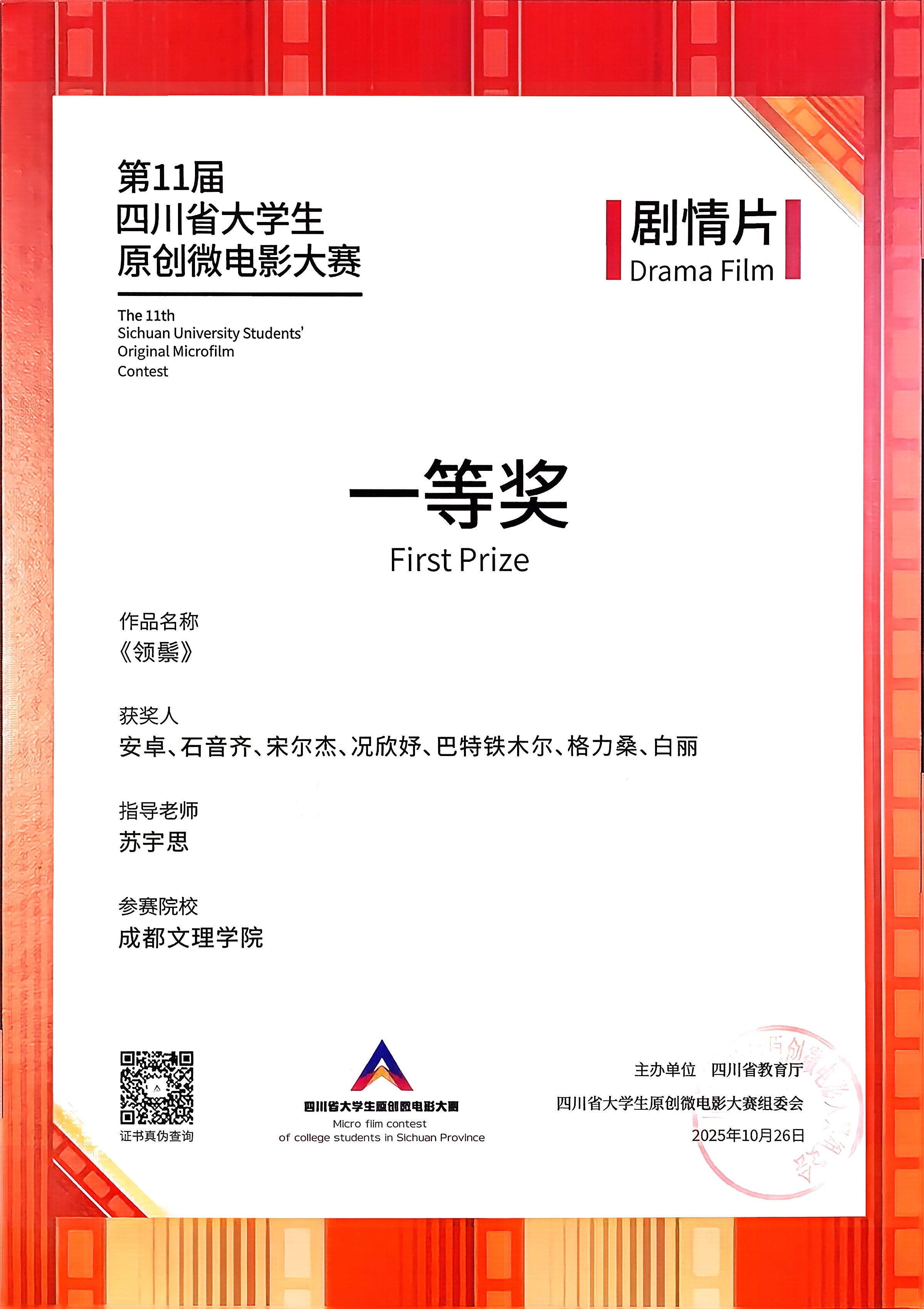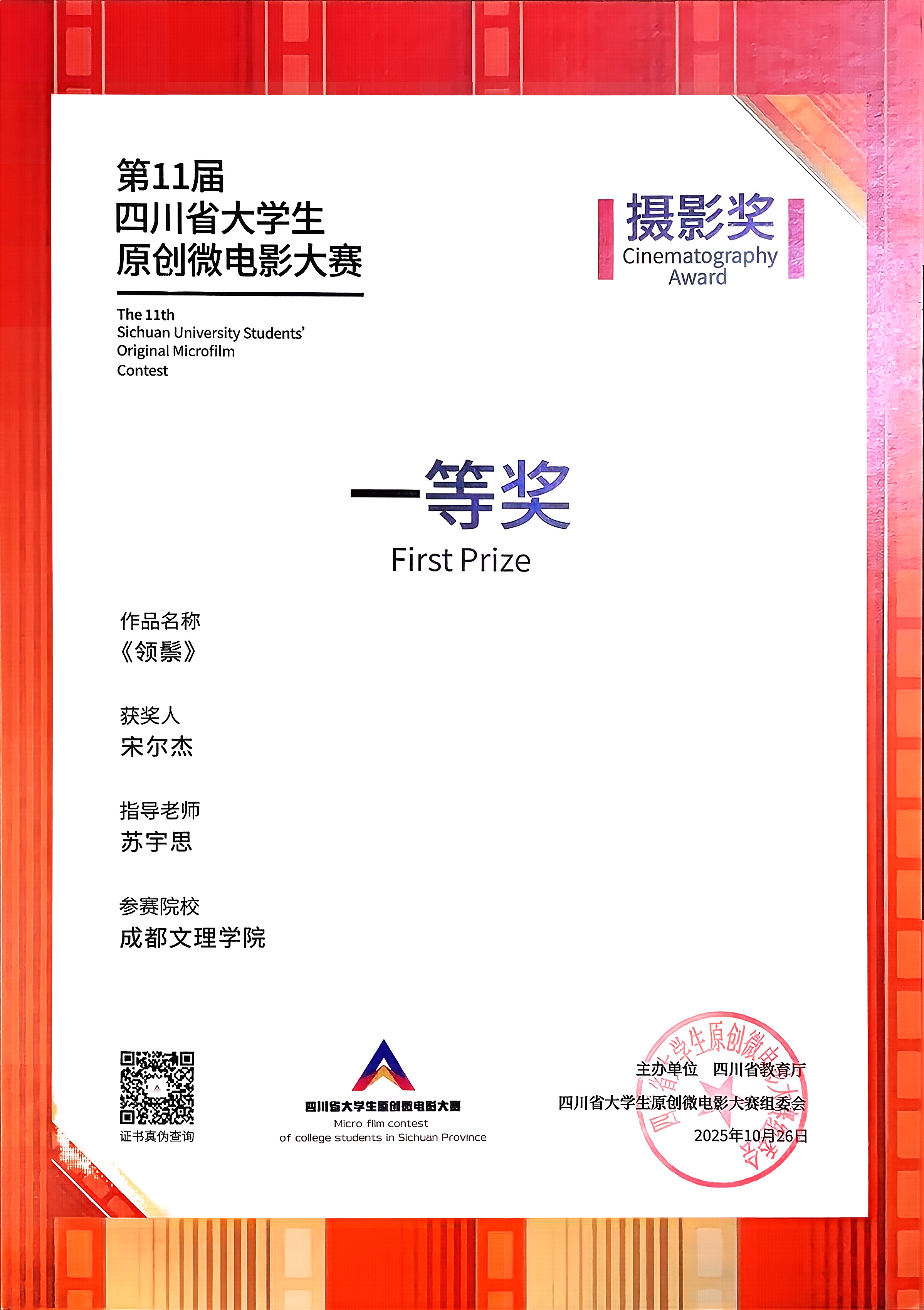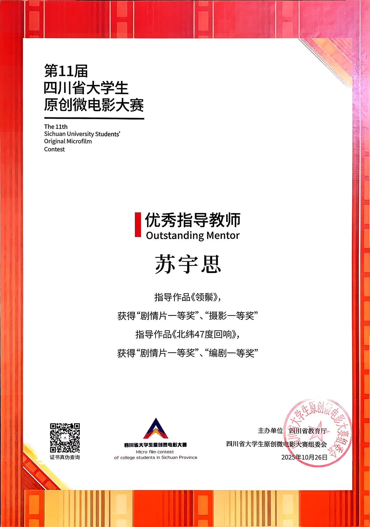 四川省大学生原创微电影大赛系省级本科高校重点竞赛项目,入选四川省白名单赛事。本届大赛以“青春激情、专业品质、文化品位”为宗旨,采用“大学生办、大学生看、行业+专家评审”的机制,经多轮严格评审,最终评选出剧情片、纪录片、专业单项奖及论文类四大类奖项。传媒与演艺学院学子在本届比赛中表现突出,多部作品在立意、制作与表达上均获评审委员会高度认可。蒲融老师指导作品《画展》获动画与实验片二等奖;作品《安拉的女子》获编剧三等奖;肖光毅老师指导作品《地下星光》获摄影二等奖,作品《听风者》获纪录片三等奖、剪辑三等奖;苏宇思老师指导作品《领鬃》获剧情片一等奖、摄影一等奖,作品《北纬47度的回响》获剧情片一等奖、编剧一等奖、表演二等奖,苏宇思老师荣获“优秀指导教师”奖。这些成绩的取得,充分体现了传媒与演艺学院广播电视编导专业“课堂即为片场”的全流程实践教学特色。在学院领导的统筹与教研室教师的精心指导下,通过“理论教学—实践创作—赛事锤炼”的贯通培养,学生综合能力得到有效提升,最终在本年度省级重要专业赛事中取得历史性突破。